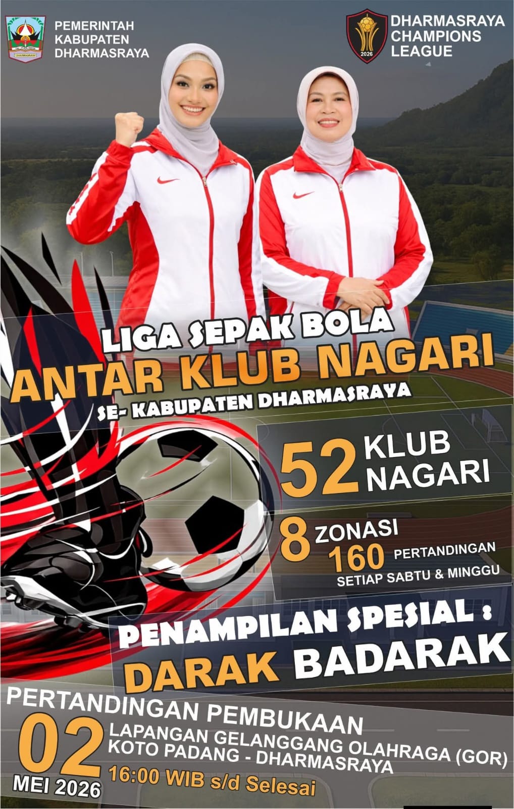 Dharmasraya (Minangsatu) — Pemerintah Kabupaten Dharmasraya kembali menghadirkan gebrakan di bidang olahraga melalui gelaran Dharmasraya Champion League (DCL) 2026, sebuah kompetisi sepak bola antar klub nagari terbesar di Sumatera Barat yang menjadi program unggulan Bupati Annisa Suci Ramadhani.