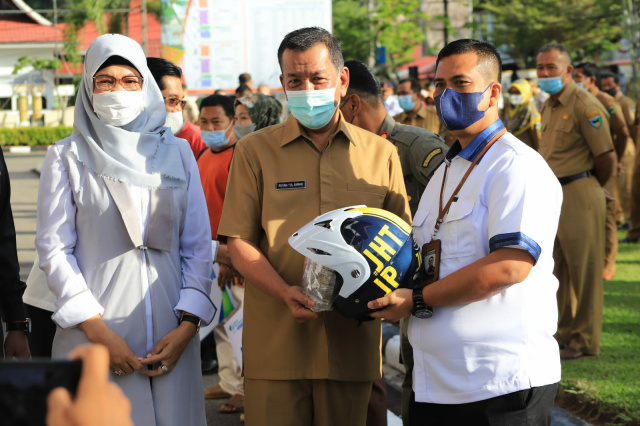Selain itu bupati menyerahkan bantuan helm sebanyak 50 buah kepada anggota Satpol PP yang diterima oleh Kasatpol PP Dailipal dan karyawan BPR Lengayang.