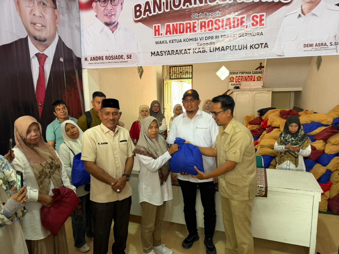 Sarilamak (Minangsatu) - Bupati Lima Puluh Kota, Safni mendampingi Anggota DPR RI Andre Rosiade menyalurkan sebanyak 3000 paket bantuan sembako kepada masyarakat Kabupaten Lima Puluh Kota, Rabu (4/3/2026). Kegiatan penyerahan paket sembako secara simbolis dipusatkan di Kantor DPC Gerindra di Sarilamak, Kecamatan Harau.