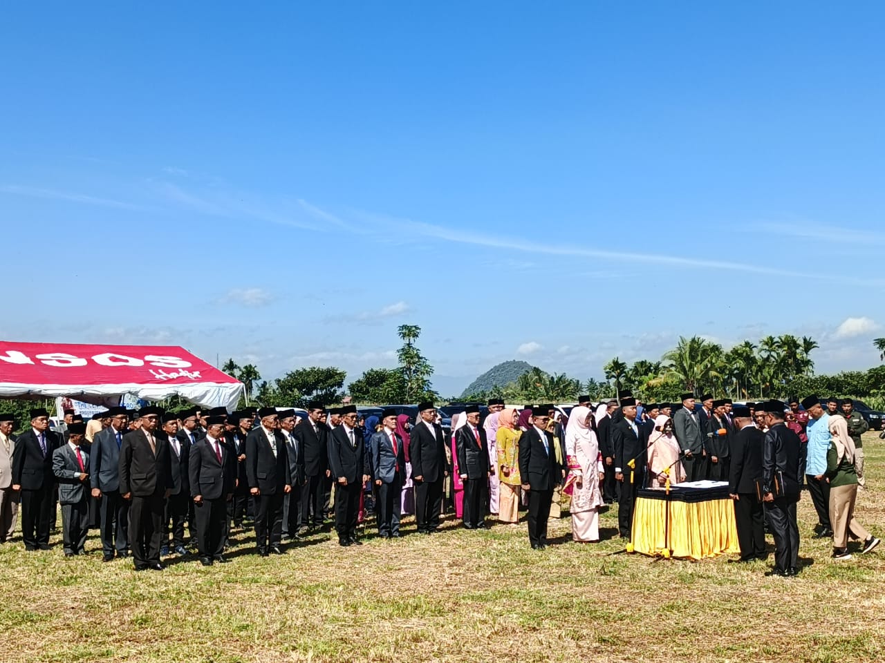 "Selama ini pelantikan selalu dilakukan di ruangan tertutup dan ber AC. Kali ini, sengaja kita lakukan pelantikan di lahan pertanian dan permukiman masyarakat ini agar bapak dan ibu semua bisa merasakan panasnya matahari yang selama ini dirasakan oleh masyarakat, khususnya petani," ujar Bupati Safni.
