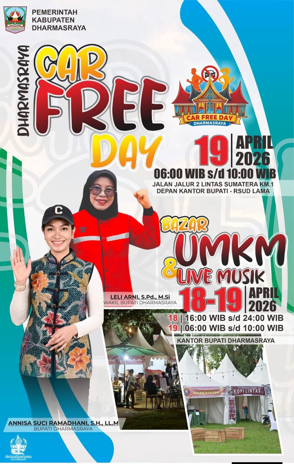 Dharmasraya (Minangsatu) - Pemerintah Kabupaten Dharmasraya segera akan buka Car Free Day (CFD) & Pasar Kuliner. Kegiatan itu, akan berlangsung pada tanggal 18 dan 19 April 2026. Bertempat di halaman Kantor Bupati Dharmasraya. Acara ini meruoakan bagian dari upaya pemerintah daerah dalam mendorong gaya hidup sehat, mengurangi polusi udara, serta menggerakkan perekonomian masyarakat dengan melibatkan pelaku usaha mikro kecil menengah (UMKM) lokal.