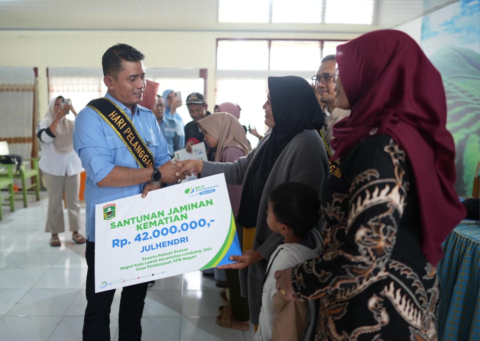 Santunan Kematian Pekerja Rentan BPJS Ketenagakerjaan Cabang Solok sebesar Rp 42 juta masing masing diterima Ahli waris almarhum Lukman Hakim, berprofesi sebagai pengojek dan petani, warga Nagari Batu Bajanjang dan Ahli waris dari almarhum Julhendri, berprofesi sebagai petani, warga Nagari Koto Laweh.