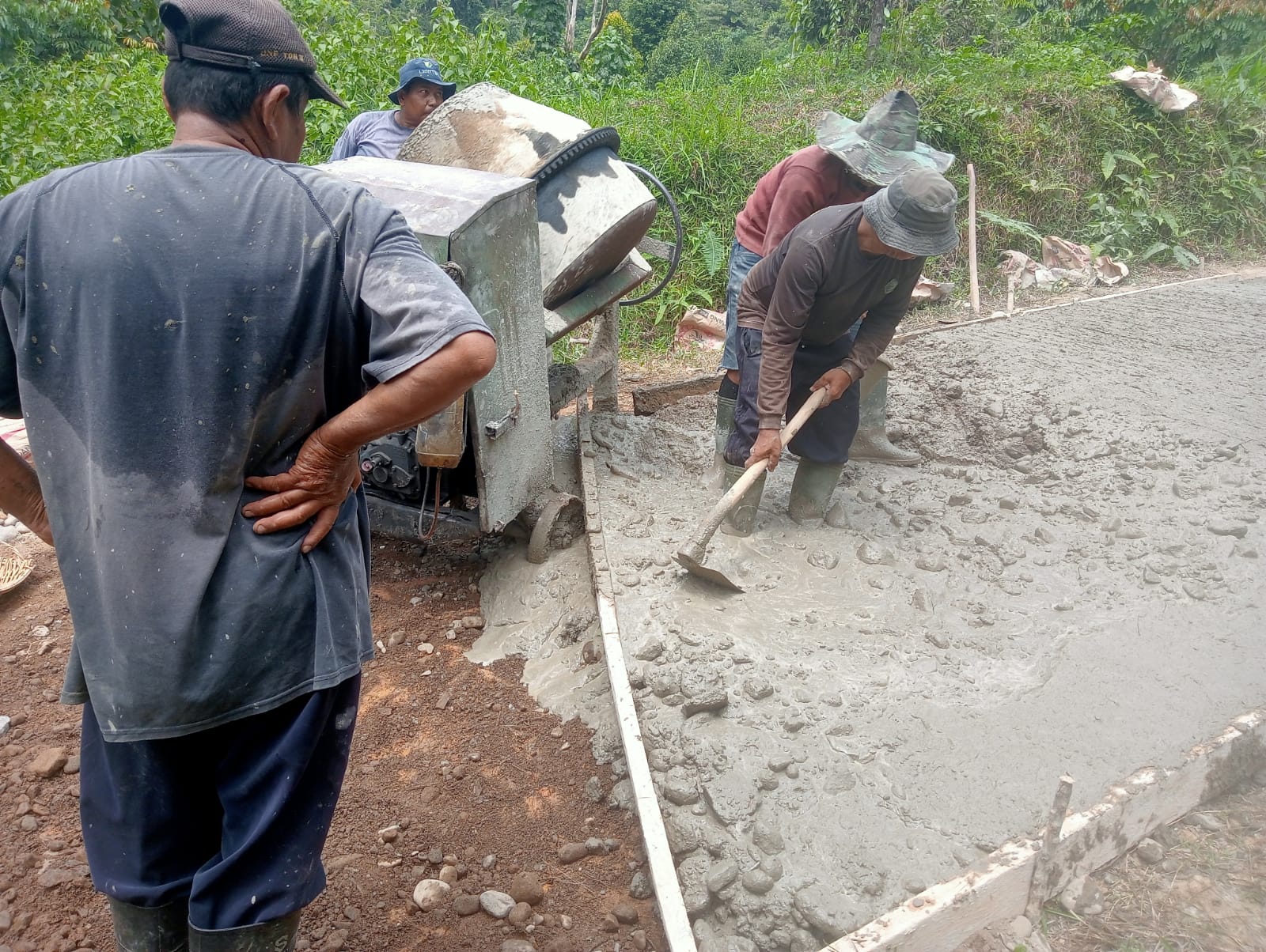Dengan cangkul, sekop, dan ember di tangan, mereka bergotong royong mengecor jalan sepanjang lereng bukit yang membelah kawasan hutan rakyat itu. Suara adukan semen yang diaduk molen bercampur dengan tawa warga. Di tengah peluh dan debu, gotong royong terasa hidup. Setiap ember semen yang dituang menjadi simbol kebersamaan dan tekad memperbaiki akses kehidupan