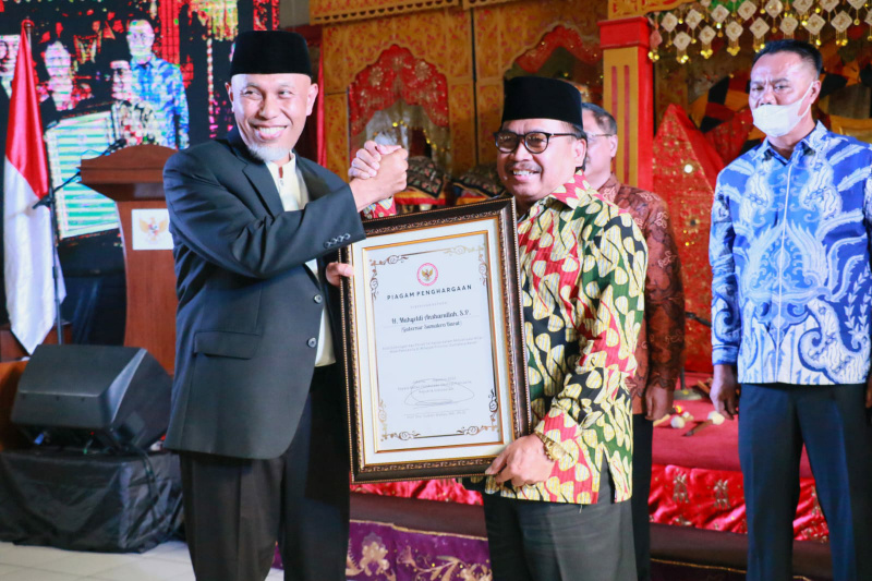 Bukittinggi (Minangsatu) - Gubernur Sumatera Barat, Buya Mahyeldi, menerima penghargaan Pembinaan Ideologi Pancasila dari Badan Pembinaan Ideologi Pancasila (BPIP), pada acara Silaturahmi Daerah Provinsi Sumbar Melalui Diskusi Kelompok Terpimpin Desa/Kelurahan Berdikari, di Istana Bung Hatta, Bukittinggi, Jumat (19/8/2022).