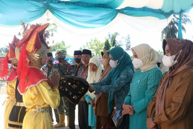 Dharmasraya (Minangsatu) - Mantan Ketua TP-PKK Dharmasraya periode 2010-2015, Ny. Hj. Zakzai Kasni Adi Gunawan, berikan bantuan uang tunai untuk membeli dua ekor kambing kepada panitia acara Halal Bi Halal, jamaah Musalla Nurul Yaqin, Perumnas RT Wisma Gunung Sari, Jorong Ganting, Kenagarian Gunung Medan, Kecamatan Sitiung, Kabupaten Dharmasraya, Provinsi Sumatera Barat.