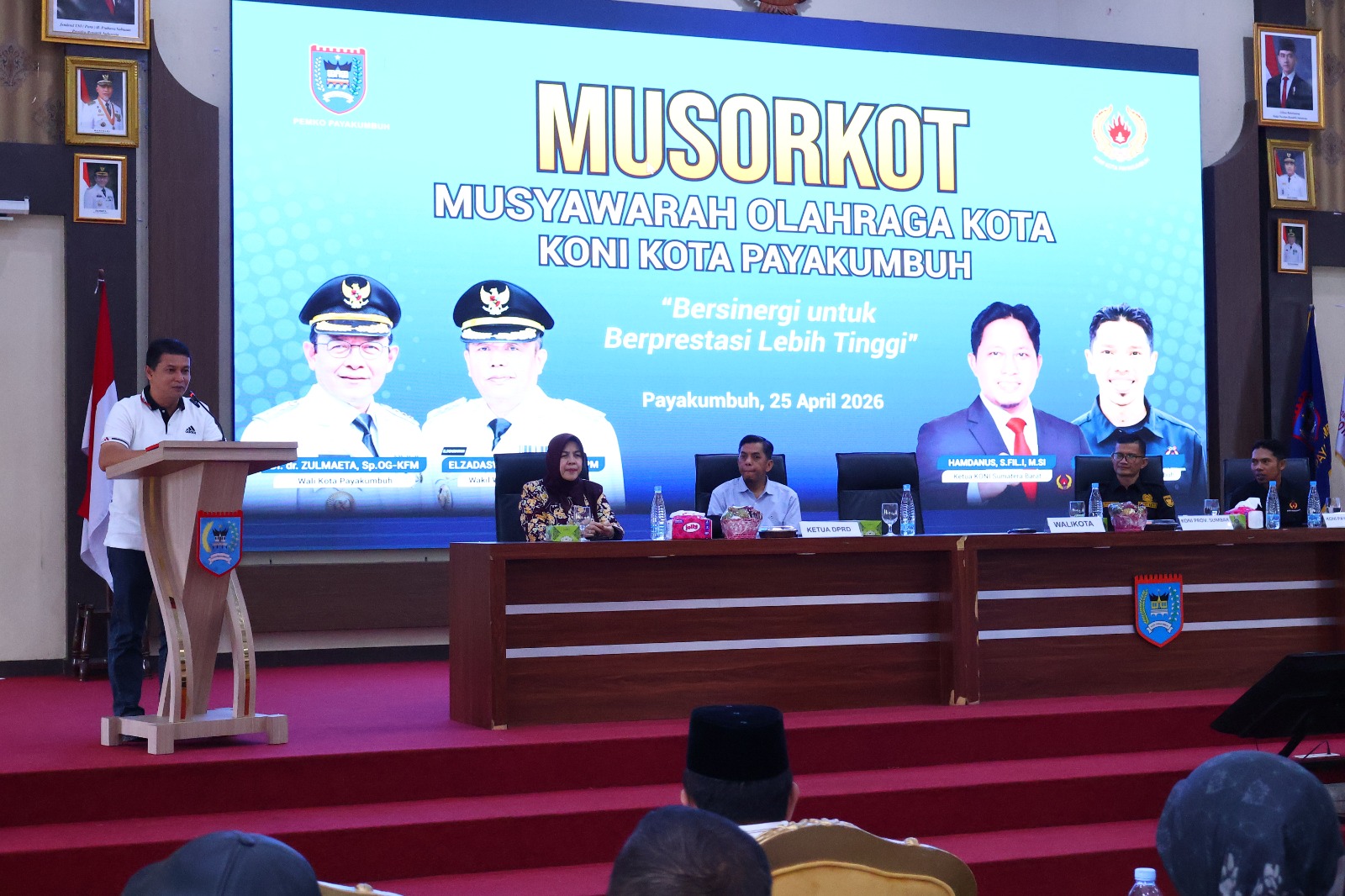 “Atas nama Pemko Payakumbuh, kami menyampaikan apresiasi dan terima kasih kepada seluruh pengurus KONI Kota Payakumbuh periode 2022–2026 atas dedikasi dan pengabdiannya,” kata Wali Kota Payakumbuh Zulmaeta yang diwakili Asisten I Nofriwandi saat membuka Musorkot di Aula Josrizal Zain, Balai Kota Payakumbuh, Sabtu (25/04/2026).