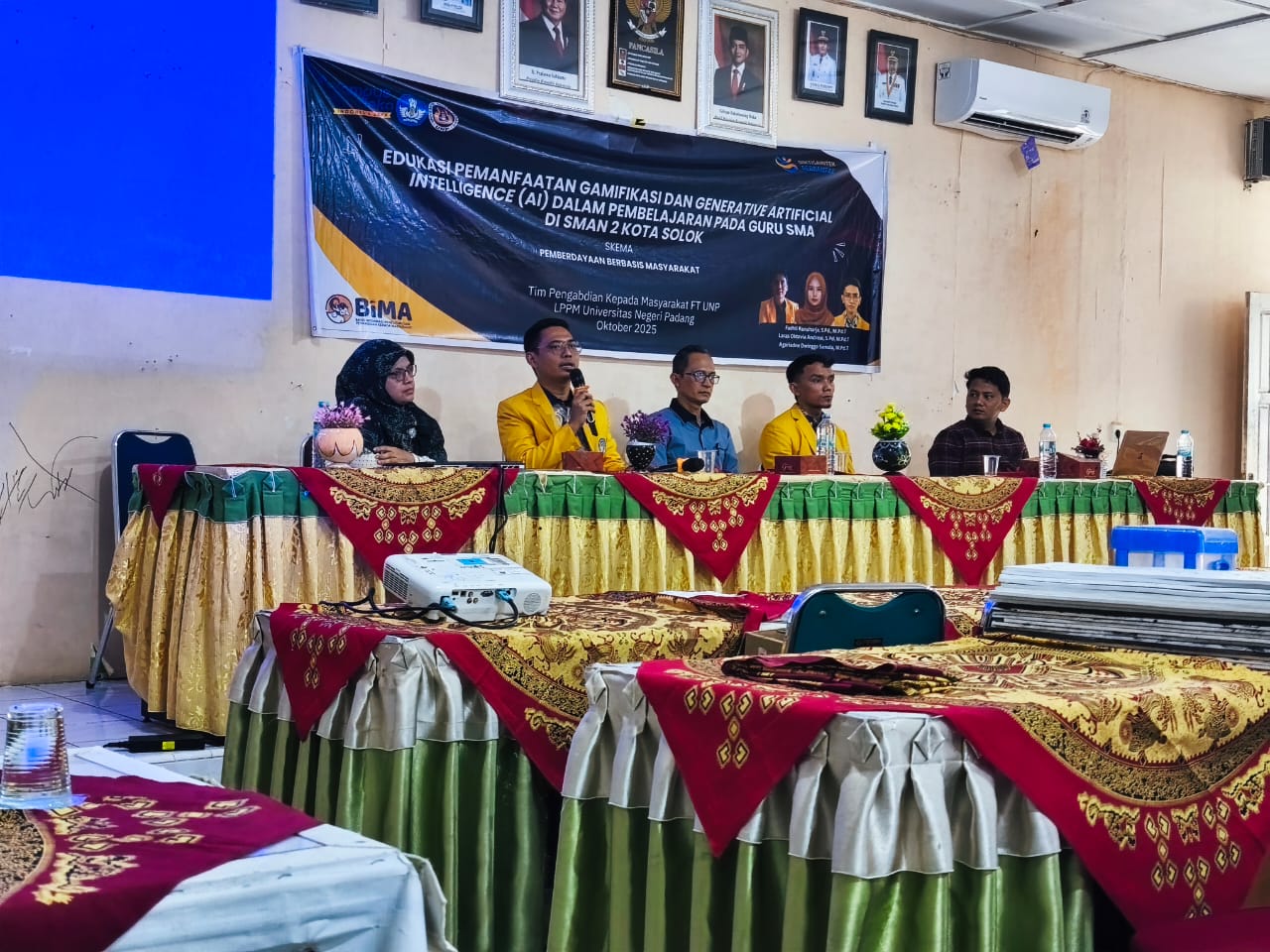 Kegiatan bertajuk “Edukasi Media Pembelajaran Berbasis AI dan Gamifikasi untuk Guru SMA” ini berlangsung pada 22–25 Oktober 2025 di lingkungan SMAN 2 Kota Solok.