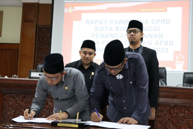 Bukittinggi (Minangsatu) - Pemerintah dan DPRD Kota Bukittinggi sahkan Anggaran Pendapatan dan Belanja Daerah (APBD) tahun 2023. Nota persetujuan ranperda APBD 2023 ditandatangani kedua belah pihak, dalam rapat paripurna, di Gedung DPRD Bukittinggi, Jumat (18/11/2022).