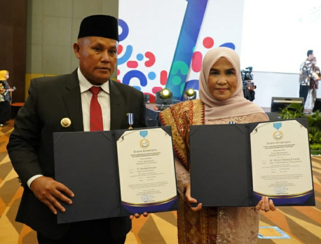 Lampung Selatan (Minangsatu) - Puncak Peringatan Hari Keluarga Nasional (Harganas) ke-29, 2022, di Hotel Santika Dyandra, Kota Medan, Provinsi Sumatera Utara, Rabu (6/7/22) merupakan torehan tinta emas bagi Bupati Lampung Selatan H. Nanang Ermanto dan Ketua Tim Penggerak (TP) PKK Hj. Winarni Nanang Ermanto. Pasalnya orang nomor satu bersama ibu di kabupaten paling Selatan pulau Sumatera ini menerima penghargaan dari Pemerintah Pusat melalui Badan Kependudukan dan Keluarga Berencana Nasional (BKKBN).