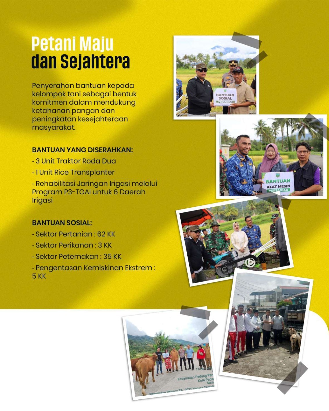 Di bidang pertanian, bantuan alat pertanian seperti traktor roda dua dan rice transplanter diberikan sebagai dukungan bagi petani. Rehabilitasi jaringan irigasi turut dilakukan untuk memperkuat ketahanan pangan kota.