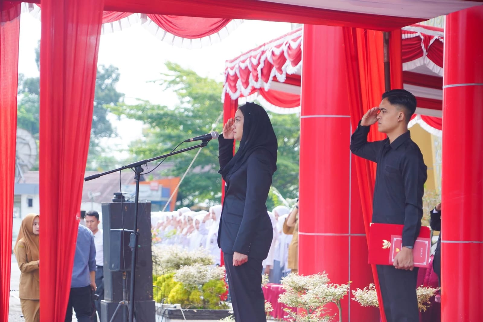 Dharmasraya (Minangsatu) - Upacara peringatan Hari Sumpah Pemuda ke-97 Tahun 2025 digelar di halaman kantor Bupati Dharmasraya, Selasa (28/10/2025) berlangsung khidmat. Bertindak sebagai inspektur upacara, Bupati Dharmasraya Annisa Suci Ramadhani, dengan Komandan Upacara Tigor Batubara.