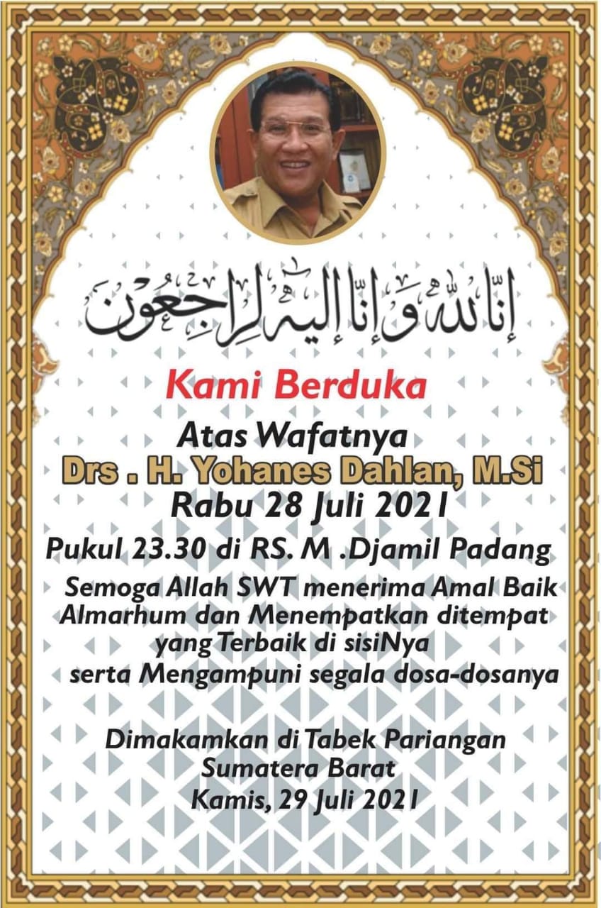 Tanah Datar (Minangsatu) - Pemerintah Provinsi (pemprov) Sumatera Barat (Sumbar) turut berduka cita yang sedalam-dalamnya atas berpulangnya salah satu pamong senior terbaik Alm. Drs.H. Yohannes Dahlan, M.Si, semoga pengabdian terbaik selama ini menjadi amalan dan ditempatkan disisi Allah SWT.