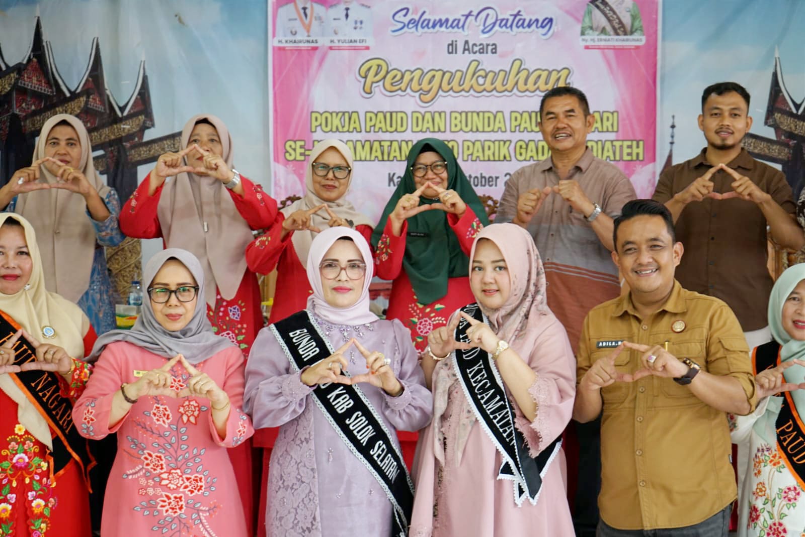 Ketua Bunda PAUD Kabupaten, H. Erniati Khairunas, memimpin langsung pengukuhan di Kecamatan Koto Parik Gadang Diateh (KPGD). Dalam sambutannya, ia menegaskan bahwa kegiatan ini bukan sekadar seremoni, tetapi menjadi awal dari tanggung jawab dan pengabdian bersama dalam mewujudkan generasi Solok Selatan yang hebat, cerdas, dan berkarakter.