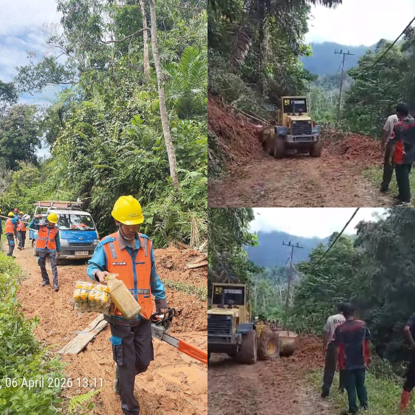 Dua unit alat berat, yakni loader dan ekskavator, dikerahkan untuk membersihkan material longsor yang menutup ruas jalan penghubung antarwilayah. Longsor tersebut sempat menyebabkan puluhan kepala keluarga terisolasi serta mengganggu aliran listrik warga.