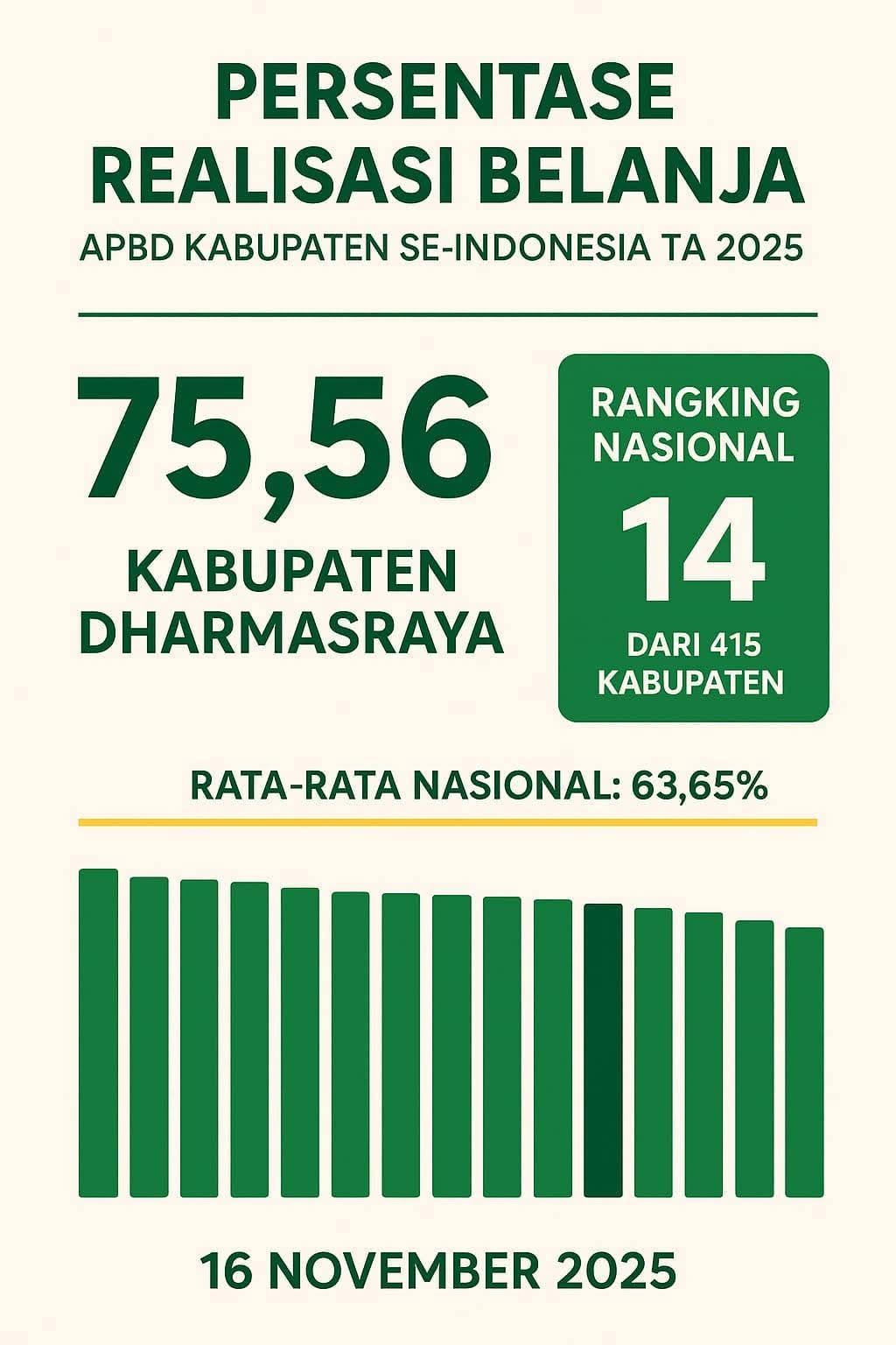 Dharmasraya (Minangsatu) - Kabupaten Dharmasraya, mencatat prestasi membanggakan dalam pengelolaan keuangan daerah. Hingga 16 November 2025, realisasi belanja APBD Kabupaten Dharmasraya telah mencapai 75,56 persen. Hal ini, tentunya menempatkan daerah itu, sebagai peringkat 14 dari 415 kabupaten se-Indonesia.