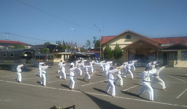 Bukittinggi (Minangsatu) - Untuk meningkatkan kemampuan dalam rangka menjaga Harkamtibmas, Polres Bukittinggi menggelar latihan Dalmas dan Beladiri Polri rutin di halaman Mapolres Bukittinggi Sabtu (26/3/2022).